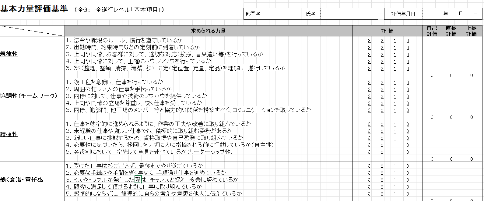 一方で、成果に対する客観的な評価も重要と考え、全社員に共通の基本力量評価基準書や個別の職務力に対する評価基準書、賃金テーブルを用いて査定を行っています。さらに、社員には自己評価申告シートを任意で提出してもらい、自身の成果を振り返ることで評価漏れを防ぎ、次期の課題を客観的に把握してもらう仕組みとしています。